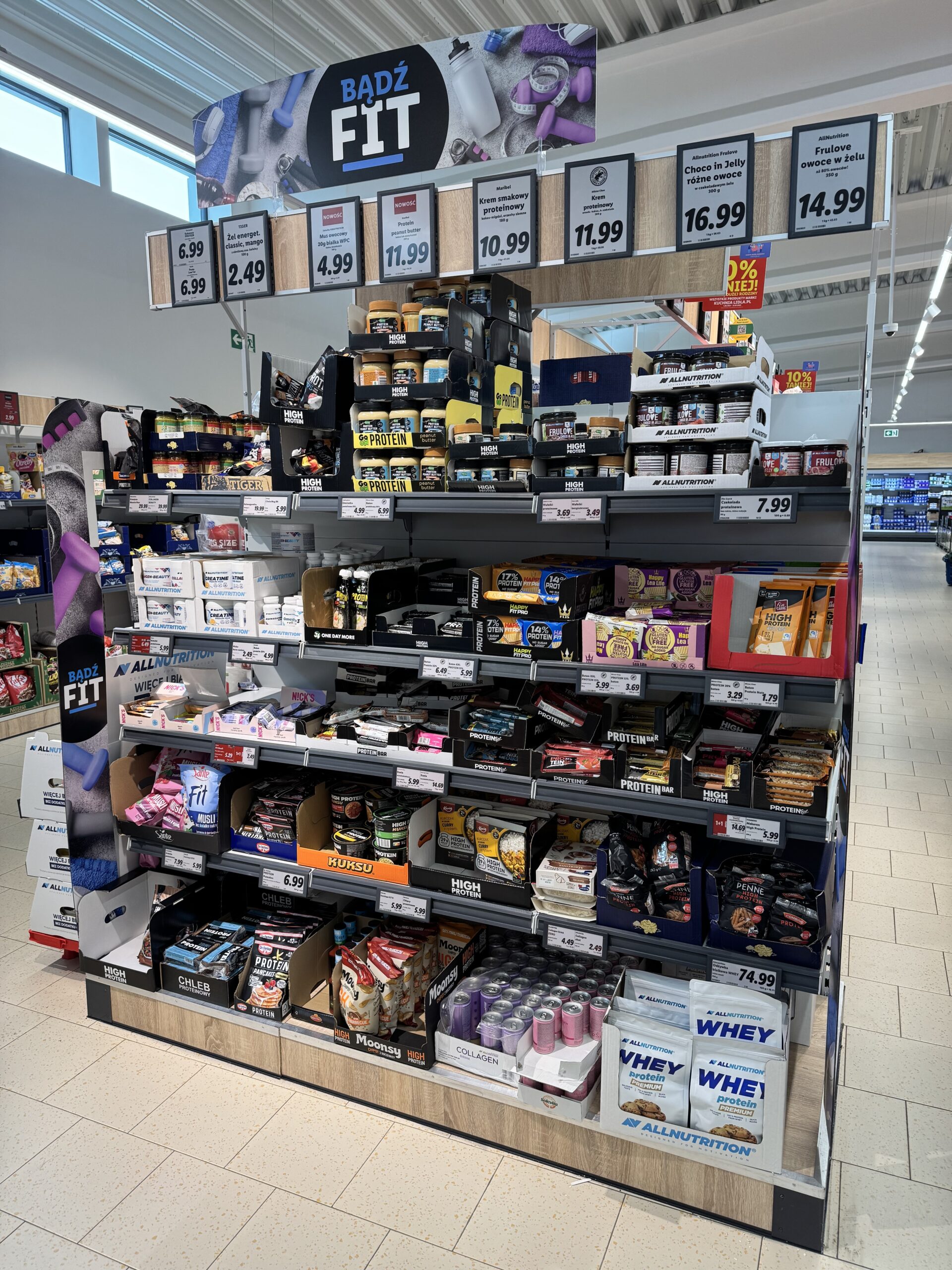 Lidl features an extended range of functional foods at a specially marked aisle end: “Be FIT.” The range includes protein drinks, energy bars, and gluten-free products.