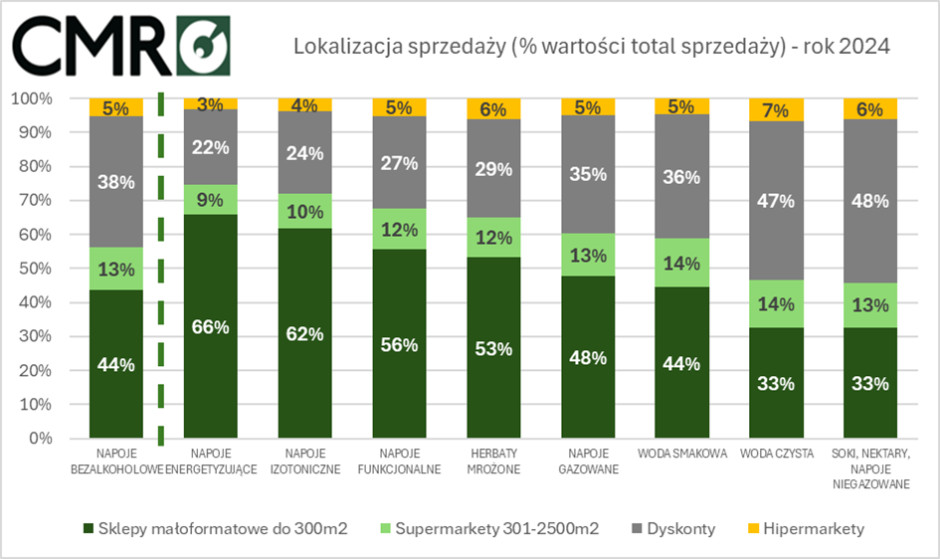 Functional beverages, in terms of value, perform best in small-format stores (up to 300 m²). In 2024, 56% of the category’s value was generated in this channel, with customers choosing from 14 variants (compared to 12 in 2023).